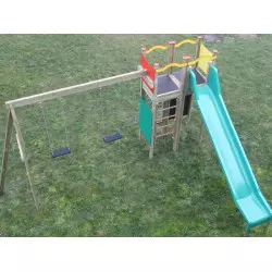 Cette structure d'aire de jeux est équipée d'un portique avec 2 balançoires, un mur et un filet d'escalade, ainsi que d'un toboggan. Le portique d'aire de jeux est conçu pour les enfants de 3 à 8 ans.