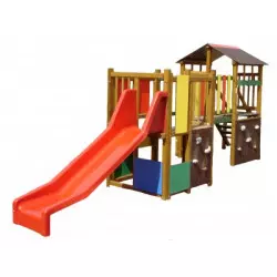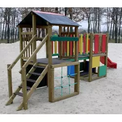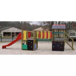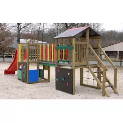 Cette structure de jeux pour aire de jeux est composée de 2 murs d'escalade, d'un toboggan, d'une cabane et d'une passerelle. La structure de jeux Abeille est conçue pour les enfants de 2 à 7 ans.