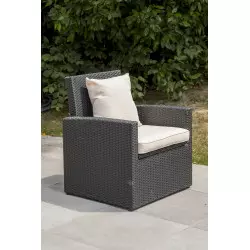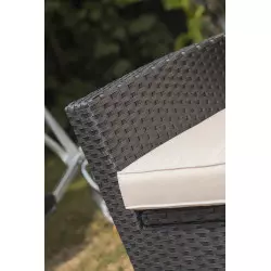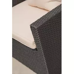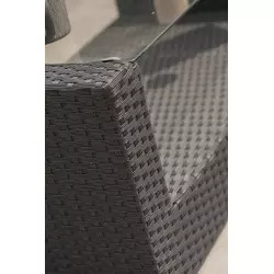 Le salon de jardin contemporain Bavardages est composé d'une table basse avec plateau en verre, 2 fauteuils, une banquette 3 places, 3 coussins d'assise et 5 coussins de dossiers déhoussables. Pratique grâce à ses coffres de rangement intégrés sous les assises. Créez un espace de détente invitant au partage avec vos proches. Ce salon de jardin de qualité est intemporel grâce à sa conception en résine tressée.