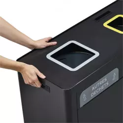 Sobre et pratique, ce meuble de tri sélectif est facilement transportable grâce à ses roulettes.